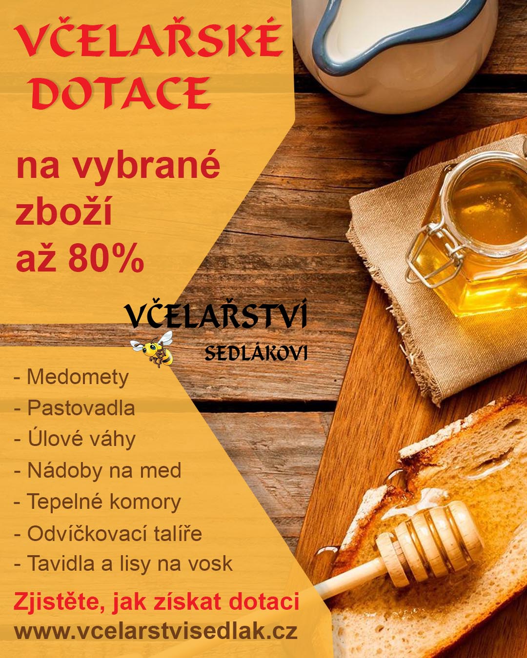 Včelařské dotace 2025/2026: Získejte až 80 % (max. 150 000 Kč) na medomety, tavidla a sklady. Pomůžeme s žádostí i výběrem. Kontakt: 739584203, Sedláková Eva.